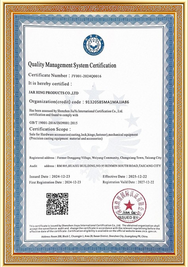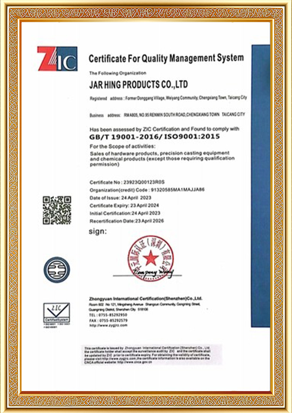 Jar Hing Products Co., Ltd. on ISO-sertifioitu ammattimainen ja luotettava teollisuustoimittaja, joka tarjoaatarkkuusvaluosa- ja palvelukeskeinen, jolle tarkkuusosia tarvitaan, erityisesti auto-, rakennus-, huonekalu-, lääke-, elintarvike-, sähkö- ja kierrätysenergiateollisuudessa jne., 14 vuoden kokemuksella.